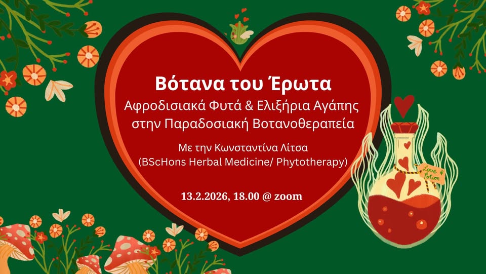 Κάποιες από τις χρήσεις των βοτάνων επαληθεύονται από σύγχρονες έρευνες, ενώ μερικά περίπλοκα μαγικά μπορεί να στηρίχτηκαν κυρίως στην αυθυποβολή. Συζητώντας τα, θα έχουμε σίγουρα ένα ευχάριστο απόγευμα με καινούργιες γνώσεις και χιούμορ! Ένα ταξίδι στον κόσμο των φυτών που έχουν χρησιμοποιηθεί κυρίως στην ευρωπαϊκή παραδοσιακή βοτανοθεραπεία, για να εγείρουν την αγάπη, τον πόθο και τον έρωτα. Μια απολαυστική εξερεύνηση ερωτικών συνταγών από μύθους και ιστορικά στοιχεία με την καθοδήγηση της βοτανοθεραπεύτριας Κωνσταντίνας Λίτσα.